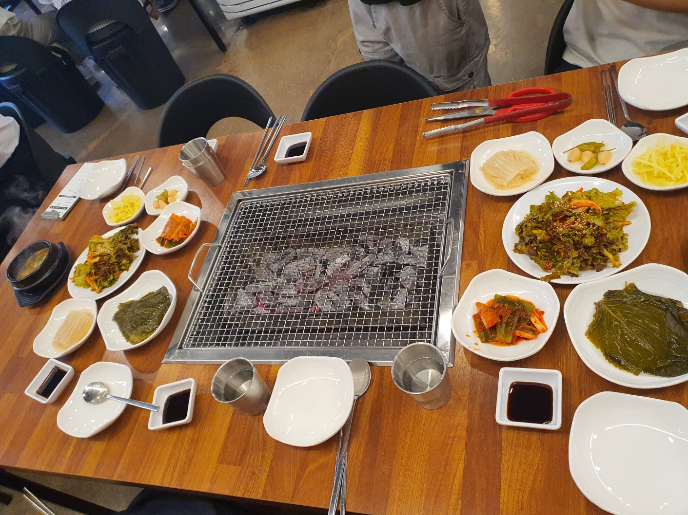 기본 반찬이 셋팅되고, 동생 커플이 오길 기다렸어요.